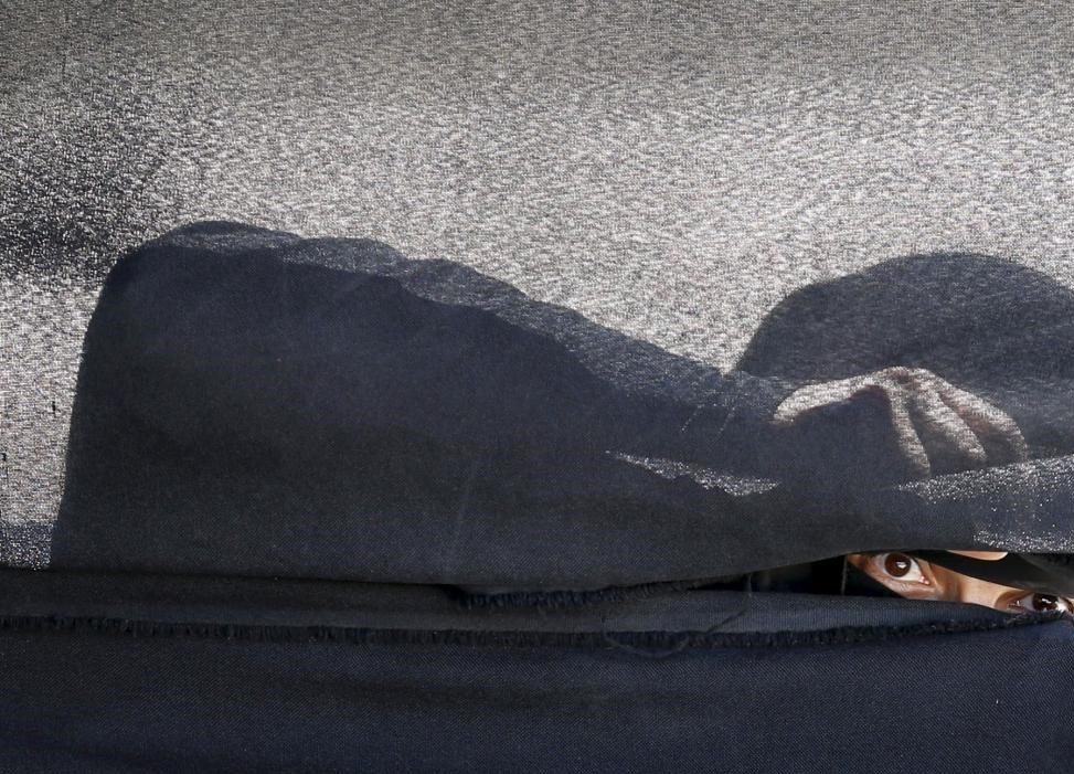 یک زن یمنی، از پشت پارچه در حال نظاره به دوربین خبرنگار