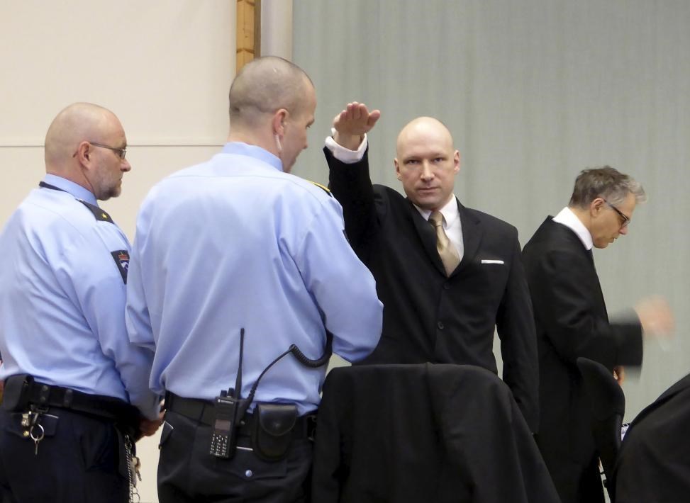 آندرس بریویک، تروریست نروژی در حال ادای سلام نازیها در دادگاه محاکمهاش