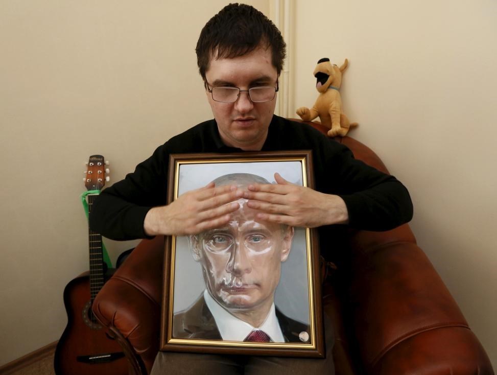 یک فرد نابینا، در موزه خاص نابینایان روسیه در حال لمس چهره سهبعدی پوتین