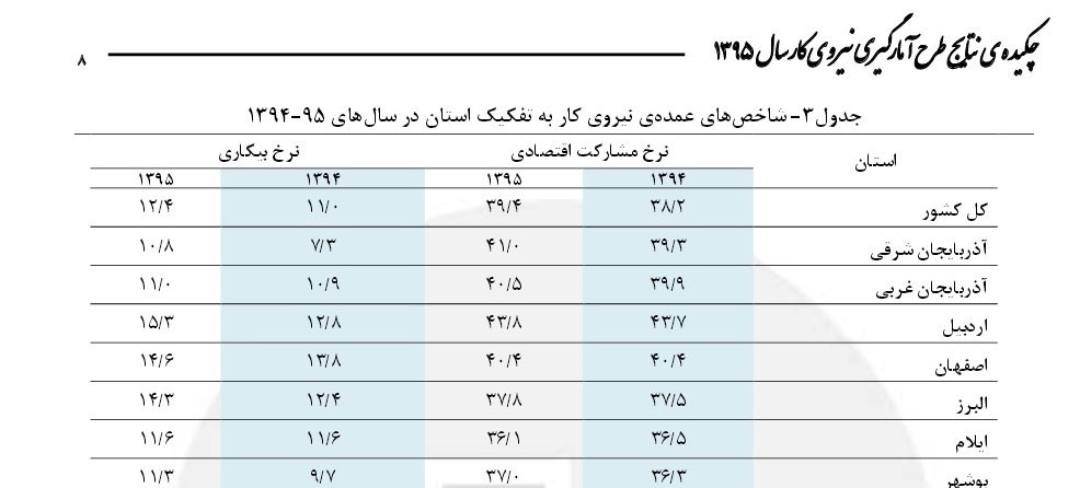 بر اساس نتایج این طرح در سال جاری 39.4 درصد جمعیت در سن کار (10 ساله و بیشتر)، از نظر اقتصادی فعال بودهاند که نرخ مشارکت اقتصادی را نشان میدهد؛ یعنی در گروه شاغلان یا بیکاران قرار گرفتهاند.