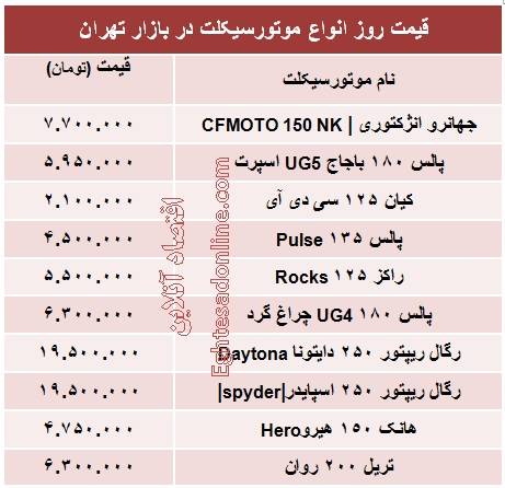 قیمت برخی از انواع موتورسیکلت در بازار تهران به شرح جدول زیر است‎:‎