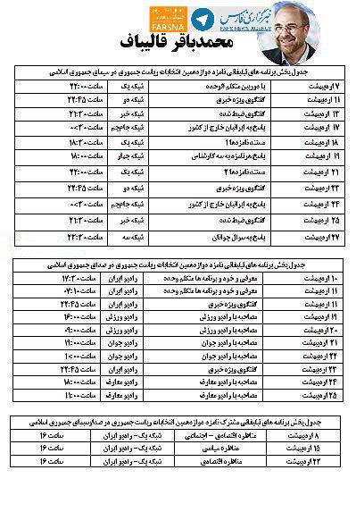 جدول پخش برنامه های تبلیغاتی نامزد دوازدهمین انتخابات ریاست جمهوری در سیمای جمهوری اسلامی