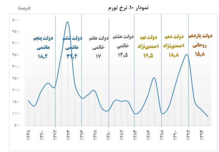 بالاترین تورم ایران در سال 75 و پس از آن در سال 91 نمایان شده است. معمولا سیاستهای بلندپروازانه دولتها در دور اول منجر به افزایش تورم در دور دوم میشود. این موضوع برای دولتهای پنجم و ششم و همچنین نهم و دهم ملاحظه میشود. دولتهای هشتم و هفتم تنها دولتهایی هستند که نرخ تورم در دور دوم دولت (در یک دوره هشت ساله ریاست جمهوری) نسبت به دور اول کاهش یافته است.