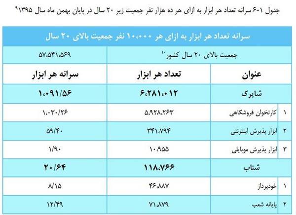هم اکنون، ابزارهای موجود در شبکه شاپرک شامل 5928263 عدد کارتخوان فروشگاهی، 341794 ابزار اینترنتی و 10955 ابزار موبایل بوده که بر این ارقام، باید ابزارهای موجود شبکه شتاب را هم افزود که شامل 46887 خودپرداز و 71879 پایانه شعب بوده است.