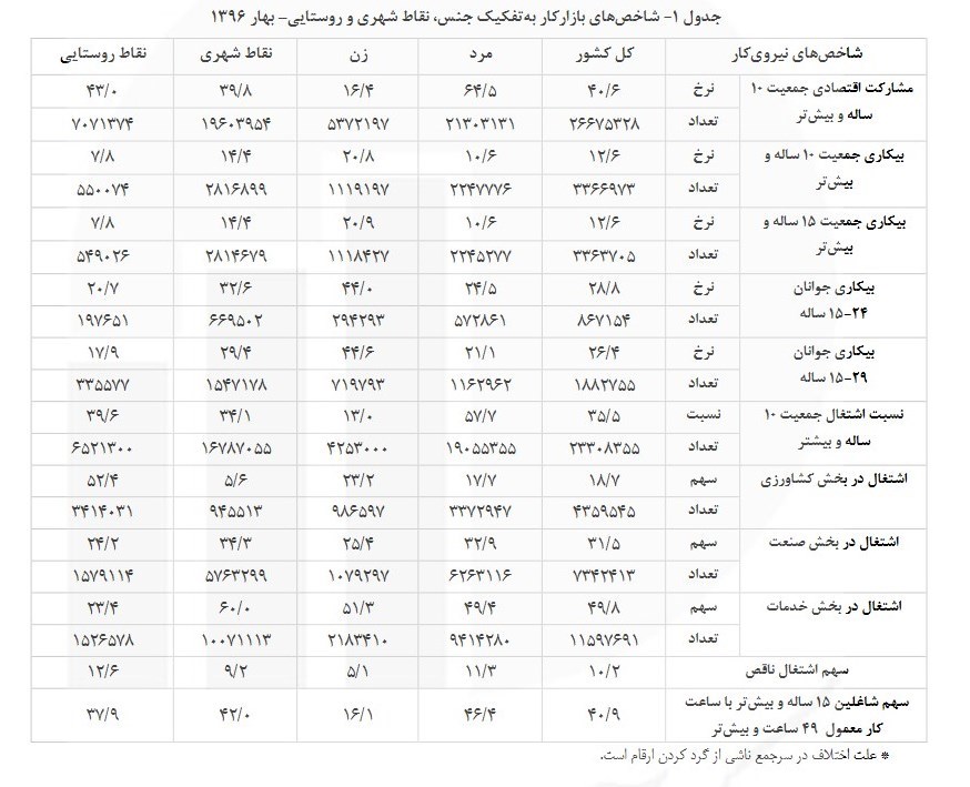 نرخ بیکاری جوانان 15 تا 29 ساله حاکی از آن است که 26.4درصد از فعالان این گروه سنی در بهار 1396 بیکار بودهاند. بررسی تغییرات فصلی نرخ بیکاری این افراد نشان میدهد، این نرخ نسبت به فصل مشابه در سال قبل (بهار 1395)1.5 درصد و نسبت به فصل قبل (زمستان 1395)، 0.9درصد افزایش یافته است. بررسی سهم اشتغال ناقص نشان میدهد که در بهار 1396، 10.2 درصد جمعیت شاغل، به دلایل اقتصادی (فصل غیرکاری، رکود کاری، پیدا نکردن کار با ساعت بیشتر و…) کمتر از 44 ساعت در هفته کار کرده و آماده برای انجام کار اضافی بودهاند.