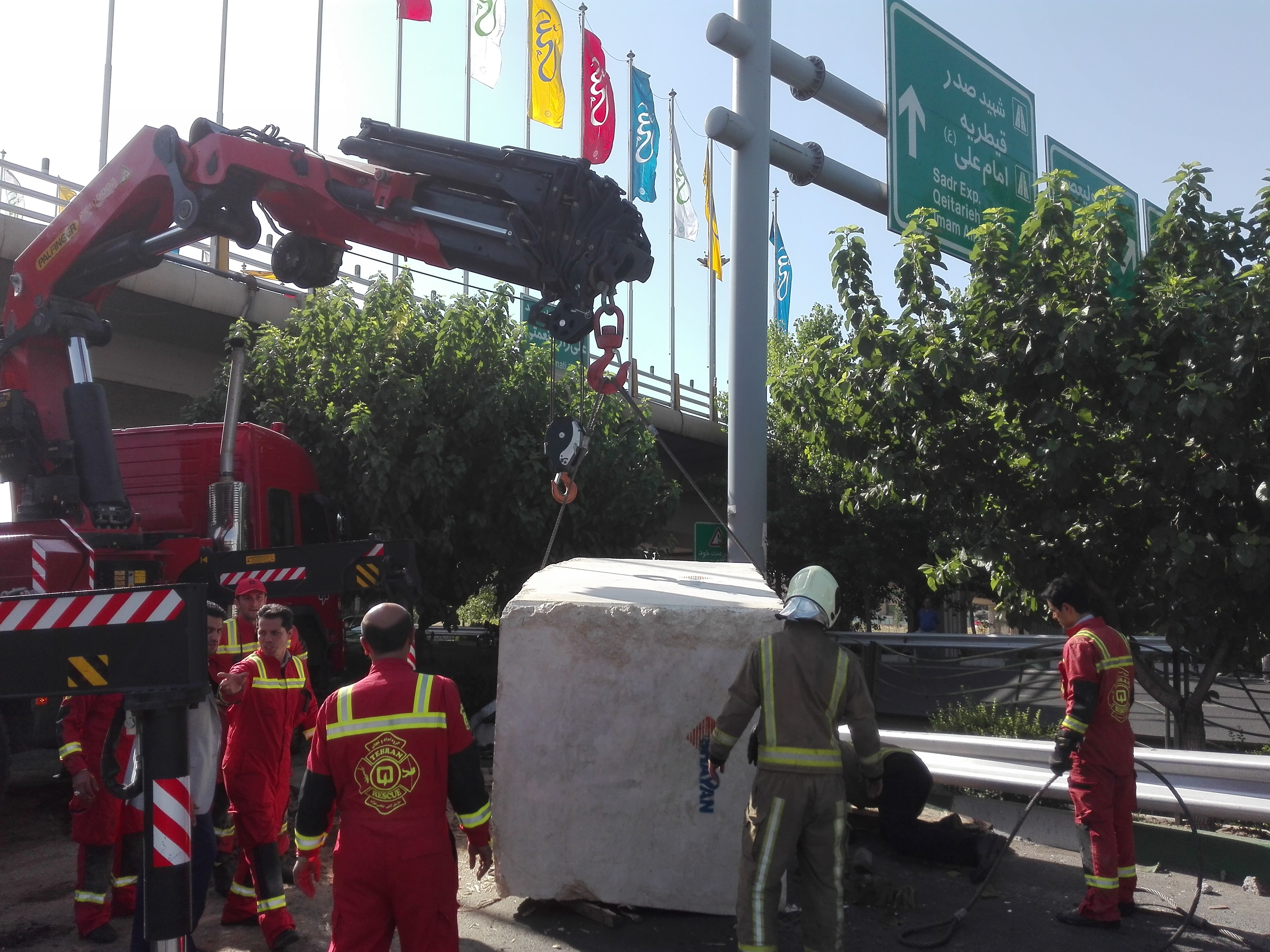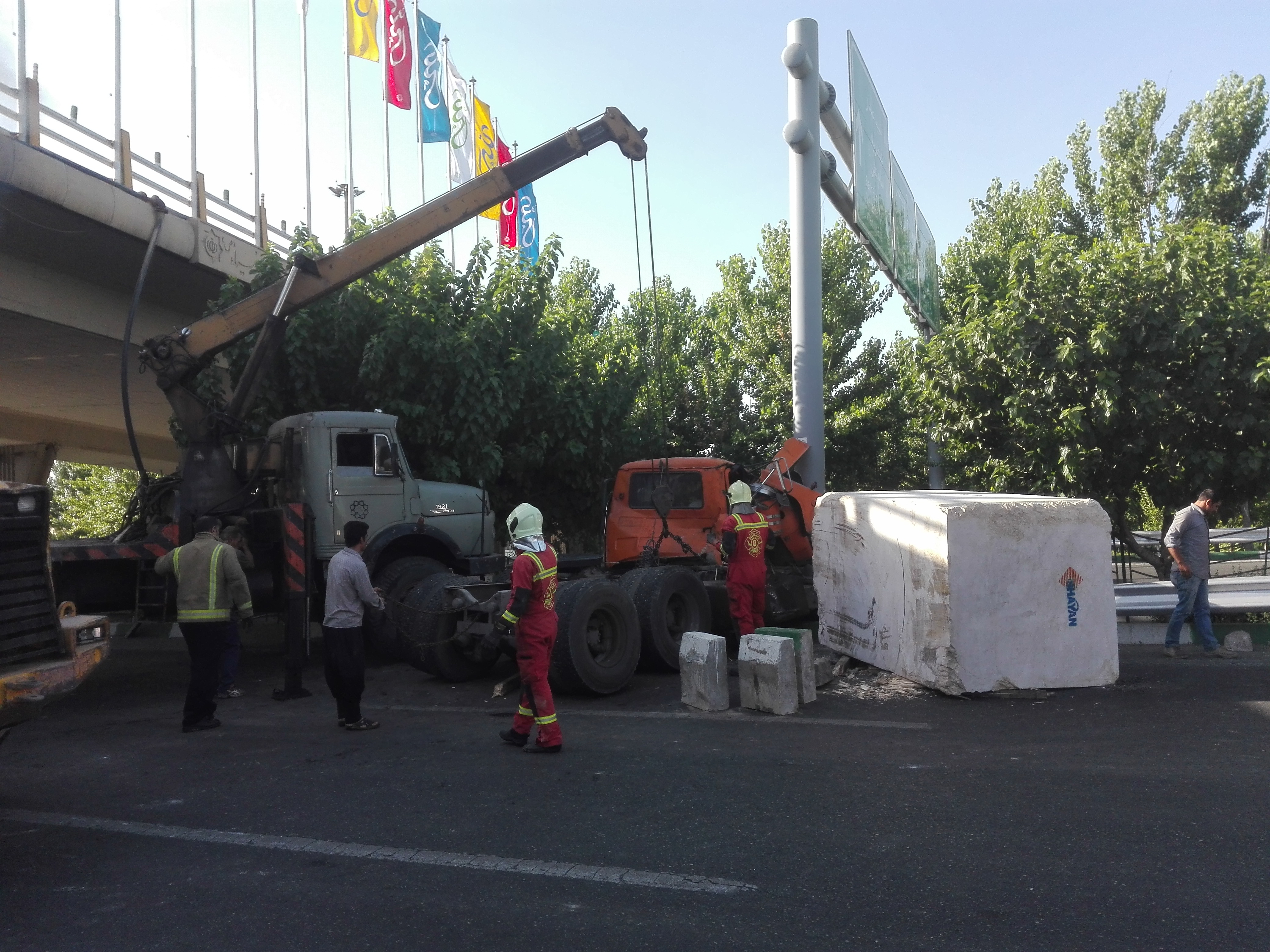 برخورد یک دستگاه کامیون کفی حامل سنگ چهار تراش با تیرک وسط اتوبان نیایش منجرب به مصدوم شدن راننده کامیون شد.