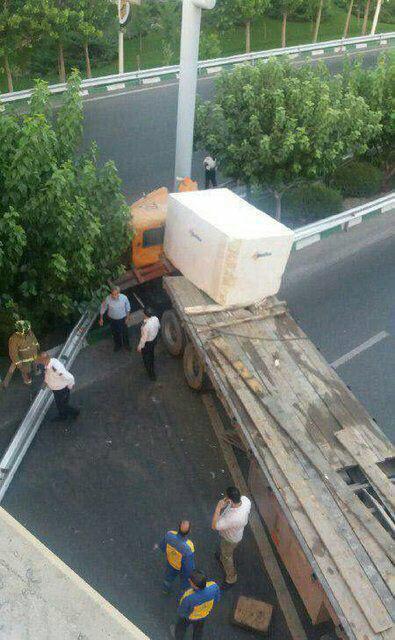 به گفته همراهان راننده این بار برای نمایشگاه سنگ بین المللی تهران آورده شده بود.