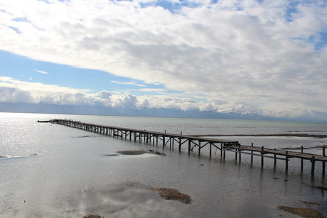 بخش زیادی از زمینهای اطراف نزدیک اسکله با گیاه قرمزرنگی پوشانده شده، خشکی که نشان میدهد آب دریا تا چه اندازه فروکش کرده است.