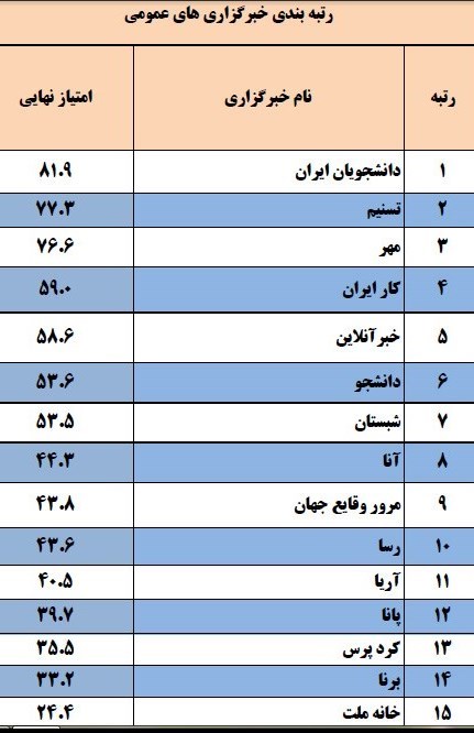 همچنان که ملاحظه می شود رتبه بندی در ٢ جدول جداگانه برای خبرگزاری های عمومی و تخصصی صورت پذیرفته است.